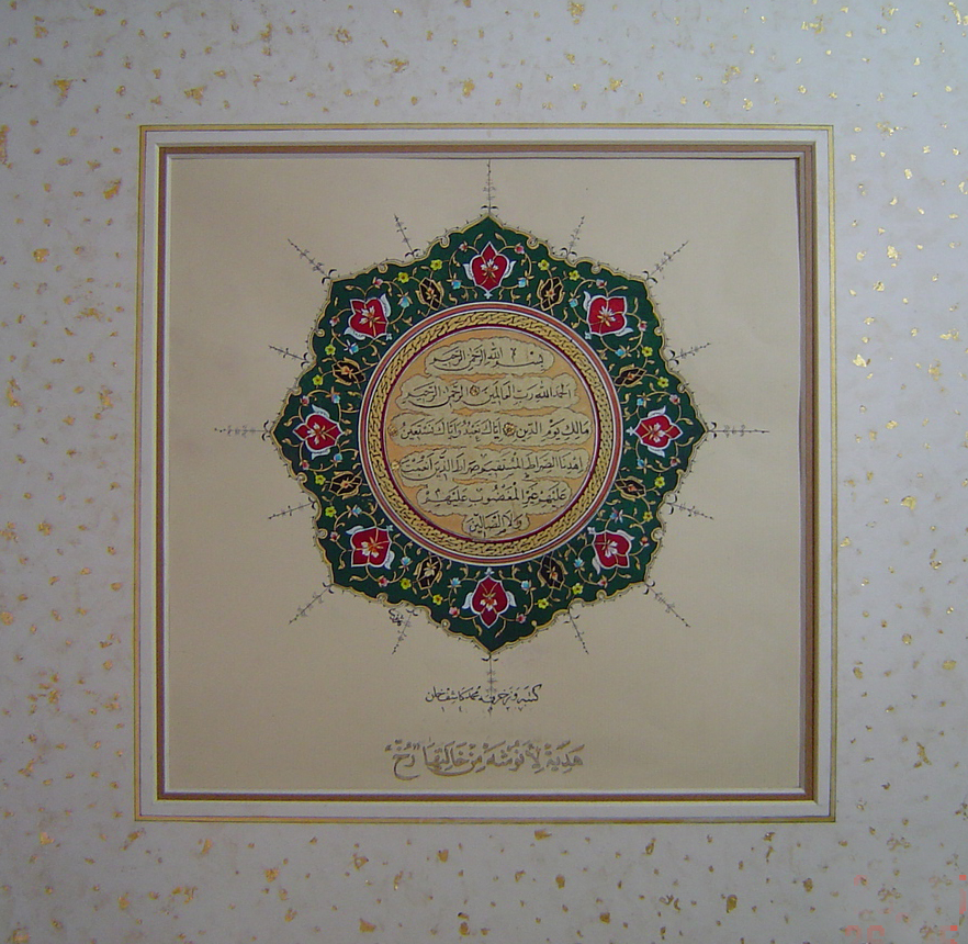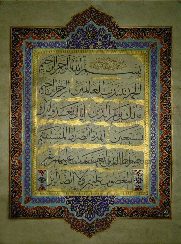 Composition of Surah Fatiha in Naskh Font with Tazhib around.